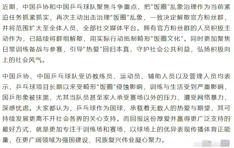 2025年1月,王楚钦、孙颖莎等国乒运动员响应中国乒协和国家乒乓球队号召,主动解散官方粉丝群,抵制饭圈文化。国乒全体解散官方粉丝群:中国乒协和中国乒乓球队决定解散所有官方粉丝群,范围扩大至全体人员、全部社交媒体平台,以治理“饭圈”乱象。王楚钦、孙颖莎作为排名世界第一的球员,影响力非常大,二人身先士卒,积极响应,解散了自己的粉丝群,其它国家队主力球员也都陆续解散了自己的粉丝群。